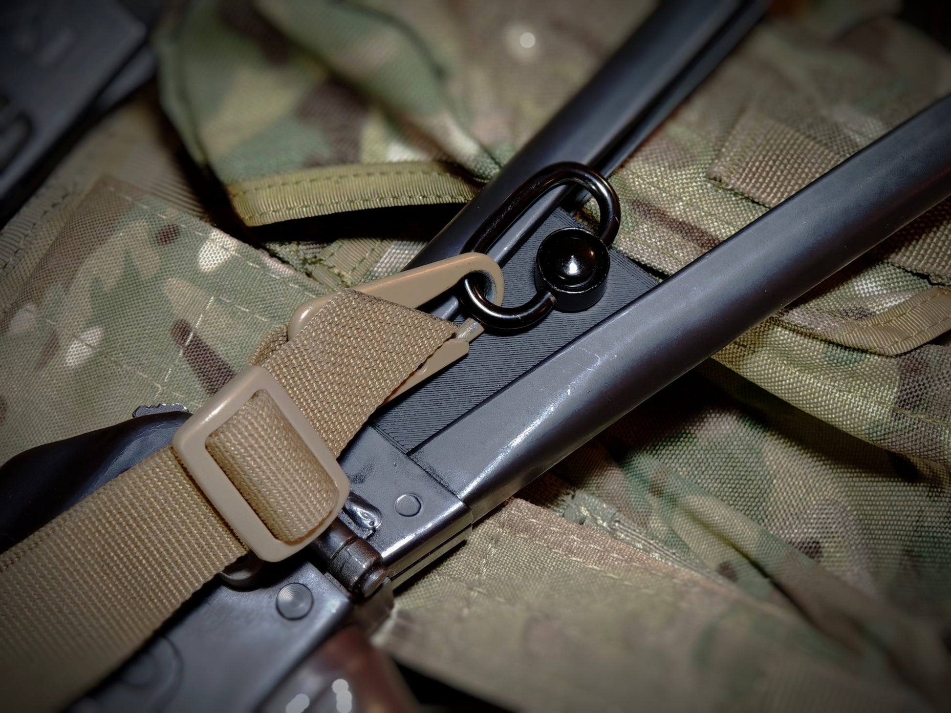 Cet accessoire exploite l'anneau attache sangle existant à droite de la crosse pour se fixer solidement, et propose un port QD à gauche, optimisant ainsi la manipulation par un utilisateur droitier.